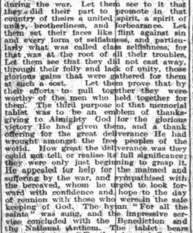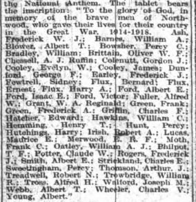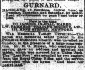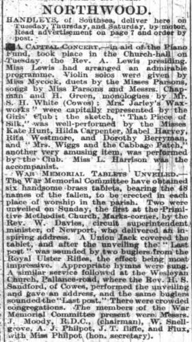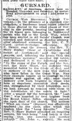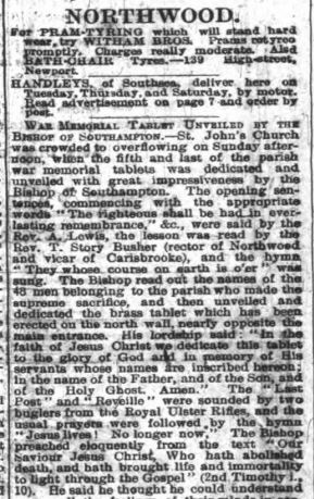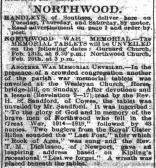 The idea of a war memorial in the parish was first mooted in February 1919 and a committee was set up. By September it was agreed that a brass tablet should be placed in each of the six places of worship in the parish at a total cost of £250, although the final cost was much less at £168 5s 9d. A house-to-house collection was made which covered most of the cost and an order was placed with Mr Osborne of Ryde. The first two memorials were unveiled in January 1921 at the Primitive Methodist Church at Marks Corner and the Wesleyan Chapel in Pallance Road. These were followed by those at the Primitive Methodist Church in Gurnard and the Wesleyan Chapel in Horsebridge Hill in early February. The memorials in All Saints, Gurnard and St John the Baptist, Northwood were unveiled later in the month. Moving ceremonies were held in all the churches and it would appear that the Royal Ulster Rifles were stationed at Albany Barracks as buglers from the regiment played the Last Post at each service.
